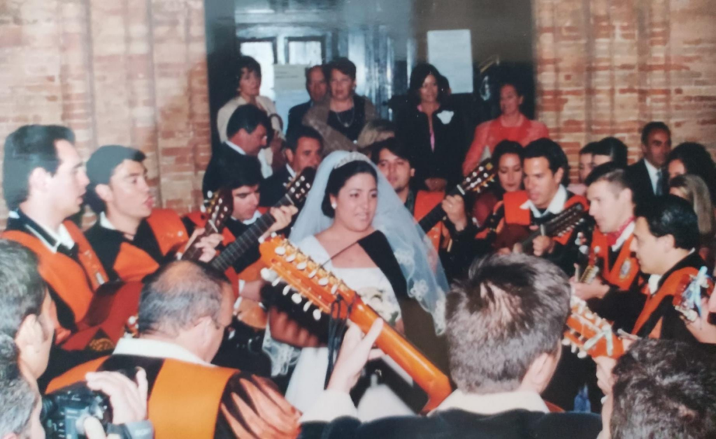 Entre los muchos recuerdos que guarda, hay uno especialmente emotivo que permanece grabado en su memoria: el día de su boda en el Monasterio de La Rábida, un lugar cargado de historia y simbolismo en la provincia de Huelva. Al salir de la iglesia, después de la ceremonia, se encontró con una sorpresa que jamás olvidará. Allí estaban los integrantes de la Tuna de Empresariales de Huelva, esperándola para dedicarle una serenata muy especial.
